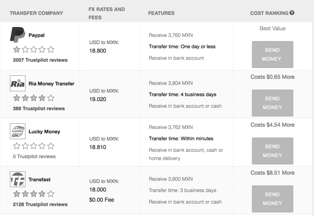 Another question is whether migrant consumers follow certain search patterns when using comparison websites. One way to measure this is by exploiting visual attention data collected using eye-tracking technology (Reutskaja et al. 2011). In this context, four key patterns emerge (Figure 2). First, migrants tend to spend significant time looking at remittance prices (i.e., fees and exchange rates). Second, when provided additional company attributes, such as delivery speed and customer reviews, their visual attention is diverted away from price. Third, migrants search webpages from top to bottom; thus, attributes associated with the first company on the page receive significantly more attention than that of the tenth company. Finally, migrants initially search for their preferred company, that is, the company they have most experience sending with.