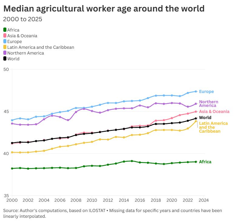 In Kenya, youth agricultural employment fell dramatically in recent decades, from 58.9% in 1990 to 28.5% in 2020. Meanwhile, Europe’s rural youth population (ages 15-24) shrank by 1.7 million between 2013 and 2019, and only 12% of the continent’s farms are managed by people under 40 in 2025. In Southeast Asia, rural youth comprised only around 7% of the total population in 2020, down from about 16% in 1950, while just 11% of Japan’s farmers are under 50. And in Latin America, 1.2 million young people are expected to leave agriculture by 2030.